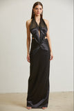 DRESS- LUXE SATIN FABRIC- HALTER NECK BUTTON CLOSURE- BRA PADDING- PLEATED DETAILING- BACKLESS- RUFFLE TRIM NECKLINE & CUT-OUT WAIST- STRAIGHT, FLOOR LENGTH SKIRT- SLIT BACK- 95%POLYESTER 5%SPANDEX